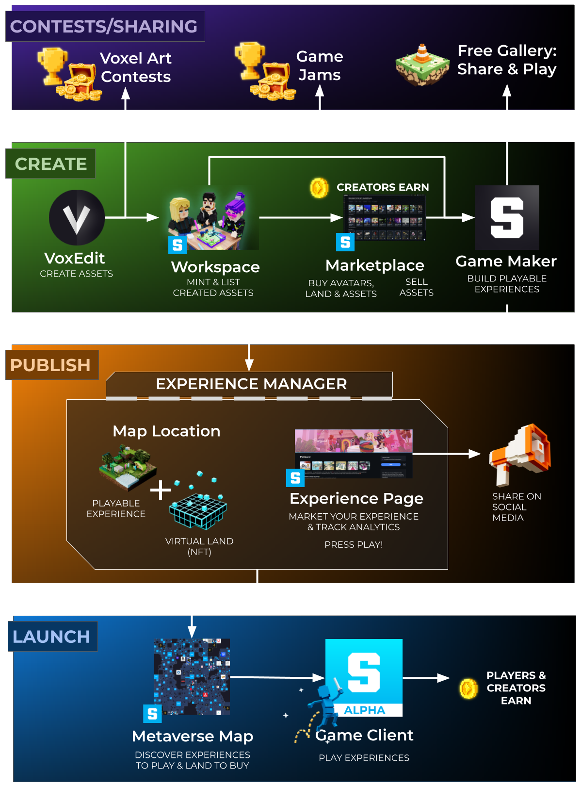 <table data-card-size="large" data-view="cards"><thead><tr><th></th><th></th></tr></thead><tbody><tr><td><p></p><p>          <img src="https://content.gitbook.com/content/83PS3g9zpWmq73xzlwFn/blobs/1fzvlXduzrUq6Imsr8kL/MAP_LandImg.png" alt="" data-size="original"></p></td><td><p><br><a href="game-maker/docs/using-blocks"><strong>Blocks</strong></a><br>Blocks are the terrain in your Experience.</p><p></p><p>Create them in <a href="voxedit/docs/block"><strong>VoxEdit's Block Editor</strong></a> by painting textures on 6 faces of a cube. Use  normal and/or emissive light and set your block to be solid or liquid and its transparency level when <a href="voxedit/upload-assets-to-workspaces"><strong>uploading to Workspaces</strong></a>.<br><br>Specific blocks can damage players and entities using Game Maker logic.</p></td></tr><tr><td><img src="https://content.gitbook.com/content/83PS3g9zpWmq73xzlwFn/blobs/YyulVjW9JdzusXvny5BF/oracles%20shop%20crop.png" alt="" data-size="original"></td><td><p><a href="game-maker/creative-guides/logic-guide"><strong>Entities</strong></a><br>An Entity is a type of <mark style="color:yellow;"><strong>asset</strong></mark> used as an interactive object, such as non-player characters (NPCs), buildings, etc.</p><p></p><p>Create assets in <a href="voxedit/create-assets"><strong>VoxEdit</strong></a> or purchase <mark style="color:yellow;"><strong>User Generated Content</strong></mark> in the <a href="https://app.gitbook.com/s/61fllYo416R30LRxku4v/general/marketplace"><strong>Marketplace</strong></a>. Use <a href="voxedit/docs/templates"><strong>templates</strong></a> to save time!<br><br>Use Game Maker to <a href="game-maker/docs/using-assets-and-objects"><strong>drag and drop</strong></a> assets and bring them to life with logic.</p></td></tr><tr><td><img src="https://content.gitbook.com/content/83PS3g9zpWmq73xzlwFn/blobs/bBb0SIDvHTW3C5bkfCwg/gm%20logic%20actor%20resize.webp" alt="" data-size="original"></td><td><p><br><a href="basics/logic-and-gameplay"><strong>Logic</strong></a><br>Every object in an Experience can be set with custom <a href="game-maker/docs/behaviours"><strong>behaviour</strong></a> and <a href="game-maker/docs/components"><strong>component</strong></a> logic to govern its actions, communication with other objects, and interactive potential.</p><p></p><p>Objects communicate with <a href="game-maker/docs/objectives"><strong>Objectives</strong></a> (quests) and <a href="game-maker/docs/game-rules"><strong>Game Rules</strong></a> to create variety of polished, unique gameplays without code.</p></td></tr><tr><td><img src="https://content.gitbook.com/content/83PS3g9zpWmq73xzlwFn/blobs/VURMDExFf14fxeLkLn5y/water%20scimitar%20-%20Elements.png" alt="" data-size="original"></td><td><a href="voxedit/creative-guides/asset-guide/equipment"><strong>Equipment</strong></a><br>Equipment is a type of <mark style="color:yellow;"><strong>asset</strong></mark> made with VoxEdit <a href="voxedit/docs/templates"><strong>templates</strong></a> that players can wear to modify gameplay and appearance. <br><br>The player's inventory includes equipment NFTs in their wallet, equipment collected during an Experience for temporary use, and collected quest items.</td></tr><tr><td>    <img src="https://content.gitbook.com/content/83PS3g9zpWmq73xzlwFn/blobs/15YtWp8AXj6wrxuBsKL7/snoop%20avatar.png" alt="" data-size="original"></td><td><a href="basics/avatars"><strong>Avatars</strong></a><br>Avatars are the means of player interaction within Experiences and represent a player's multifaceted identity. Customise logic related to player Avatars in Game Maker.</td></tr><tr><td><img src="https://content.gitbook.com/content/83PS3g9zpWmq73xzlwFn/blobs/rfWP61t2TDCouxSo7hvN/video%20banner.png" alt="Customise the look of your Experience Page with a logo, map logo, video, static images, animated GIFs, and descriptive text" data-size="original"></td><td><p><br><a href="game-maker/publish-experiences"><strong>Publish Experiences</strong></a><br>Create a free <a href="game-maker/publish-experiences/experience-manager/experience-page"><strong>Experience Page</strong></a> - even if you don't own <a href="https://app.gitbook.com/s/61fllYo416R30LRxku4v/owners/land"><strong>LAND</strong></a>! Use the link to share your project with the world and build community.</p><p></p><p>Connect your Experience to your virtual LAND so it can be discovered on the <a href="https://app.gitbook.com/s/61fllYo416R30LRxku4v/general/map"><strong>metaverse Map</strong></a> opened in the Launcher.<br><br>Use built in <a href="game-maker/publish-experiences/experience-manager/experience-analytics"><strong>Experience Analytics</strong></a> to see your page and Experience traffic over time.</p></td></tr></tbody></table>