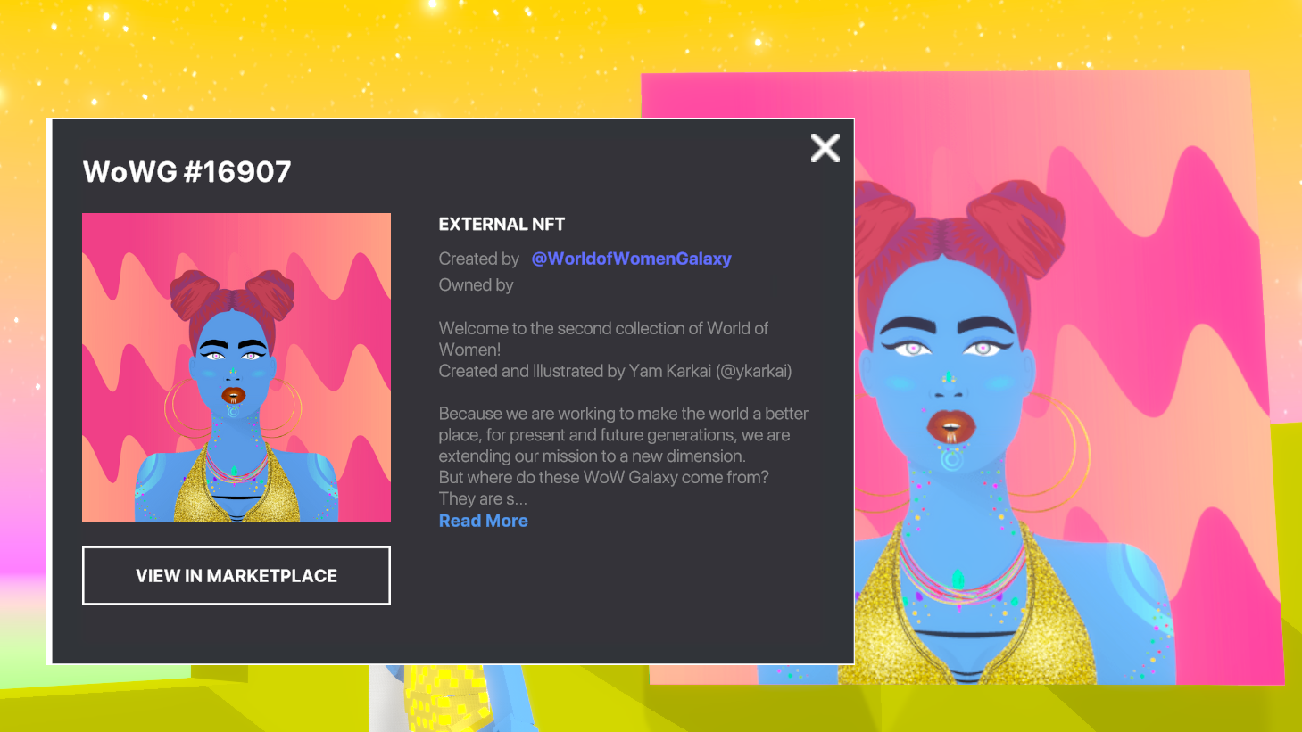The NFT Details Display component can be can be set to open for any NFT made for The Sandbox in VoxEdit or any external NFT displayed in a frame asset. Visitors can be redirected to The Sandbox or OpenSea marketplaces via browser.