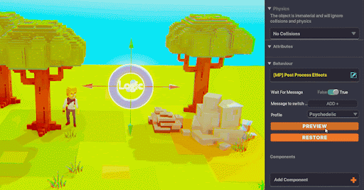Post Process Effects behaviour can be added to any object to alter the appearance of your whole Experience through the camera.