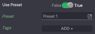 Use Preset - Determines whether the behaviour should spawn a preset or an asset from your library. Preset - If 'Use Preset' is set to True, select what to spawn from your list of custom presets. Tags - Add or remove tags that will be added to the spawned preset/asset.