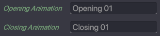 Opening Animation - select the asset's animation you wish to display when you trigger the door to open with message Closing Animation - select the asset's animation you wish to display when you trigger the door to close with message