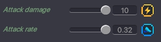 Attack Damage (slider) - Defines how many points of damage your Object will deal with a single hit. Attack Rate (slider) - Defines the time in seconds between each attack the Object performs.