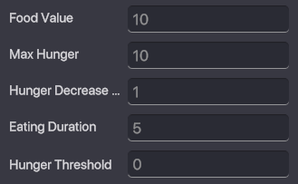 Max Hunger - The maximum hunger value that can be reached by the Object. When the Prey is hungry, it will look for Food Tags. Hunger Decrease Rate - How much hunger your Object loses automatically per second. Eating Duration - The time, in seconds, that it takes for the Object to eat a target. Hunger Threshold - Determines at which hunger level your Object must be to look for Food Tags.