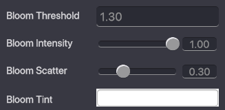 Bloom Threshold - Bloom Intensity - Determines how strong the bloom (glow) effect is. Bloom Scatter - Determines the range of the bloom effect. Higher values makes the bloom effect radiate at a larger distance. Bloom Tint - Select the colour of your bloom effect.