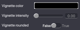 This variable can be set between 0-1, where 0 results in no Vignette, and 1 creates a thick semi-transparent border around the screen, leaving only a small oval or circle in the centre of the screen.