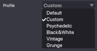 Profile - Take a pick from a range of preset Post Process Effects, or make your own Custom effect. Choosing 'Custom' will give you a range of parameters to edit.