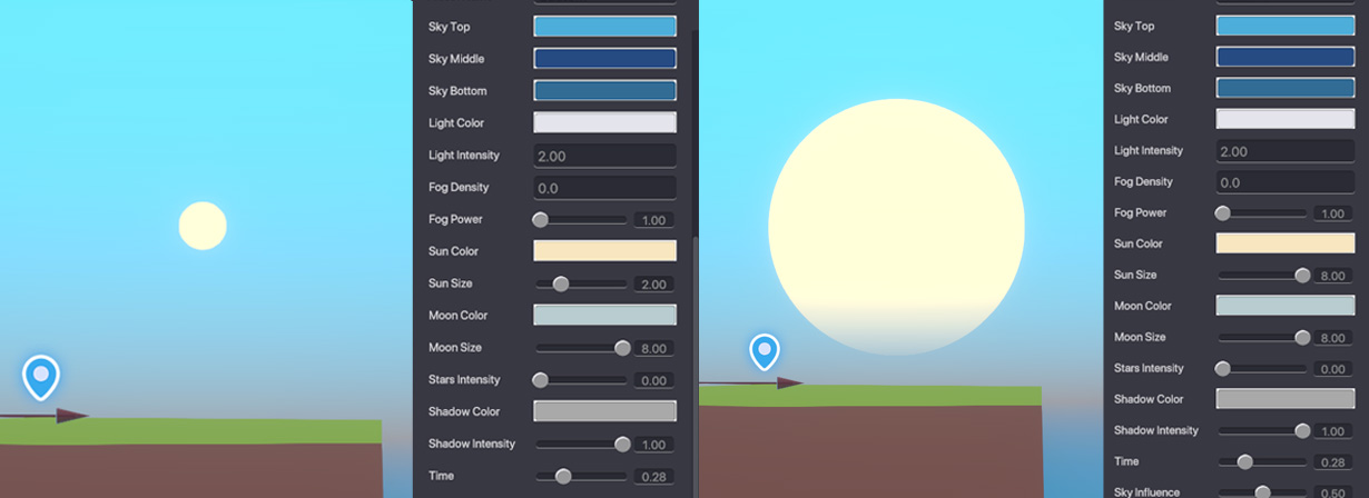 Sun Colour - Allows you to change the colour of the sun. Sun Size - Determine the size of the sun in the sky.