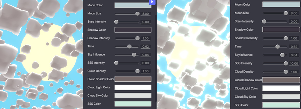 SSS or Sub Surface Scattering is the parameter that defines how light bounces around and exits clouds. This appears as a halo of light when the sun or moon is directly behind them.