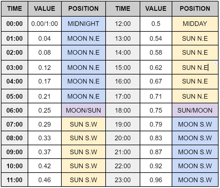Use the table below as a guide for setting the time of day and the position of the Sun and Moon.