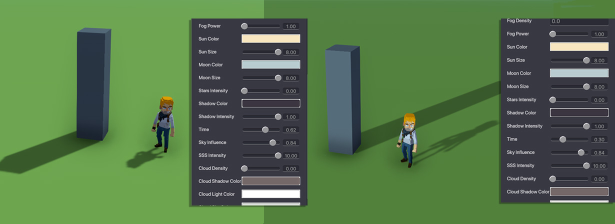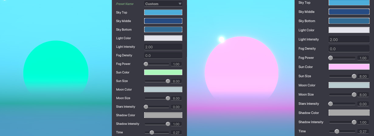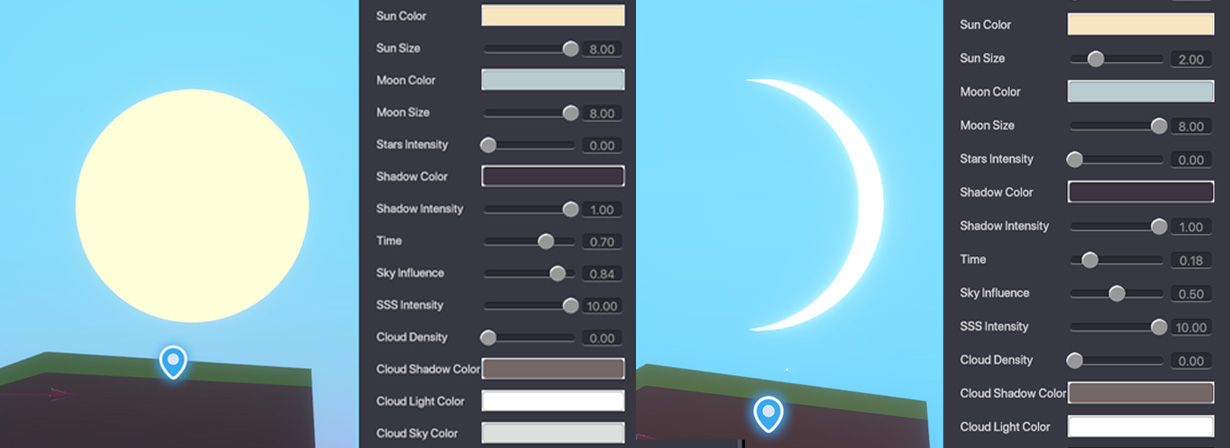 Time controls the position of the Sun and the Moon in your experience and can be set using the sliders or field between 0.00 - 1.00.