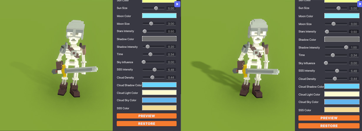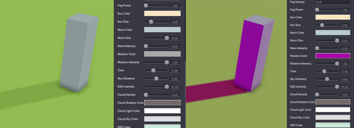 Shadow Colour - Changes the colour of shadows. Shadow Intensity - Determines how light or dark the shadows are. Higher values result in darker shadows.
