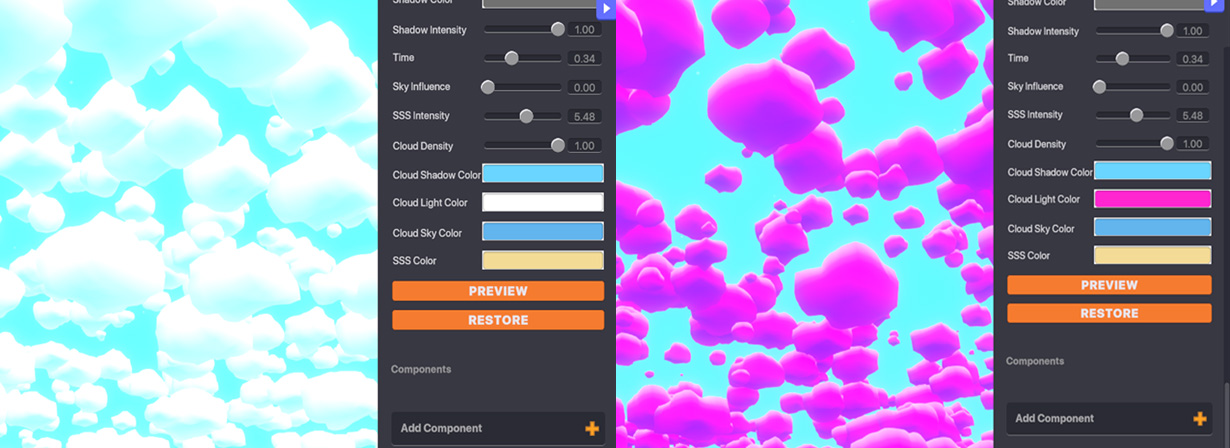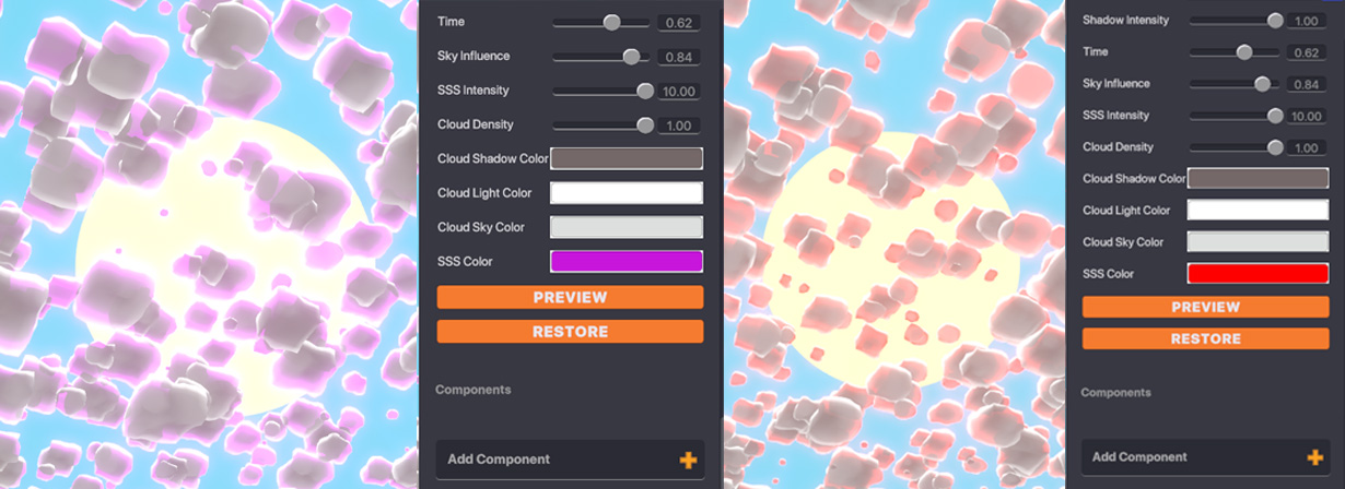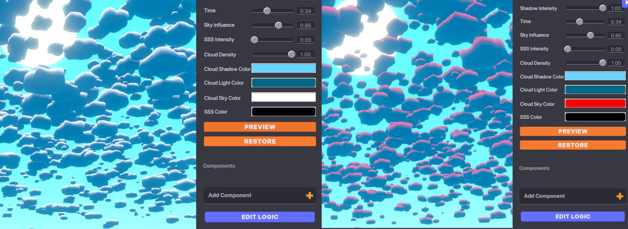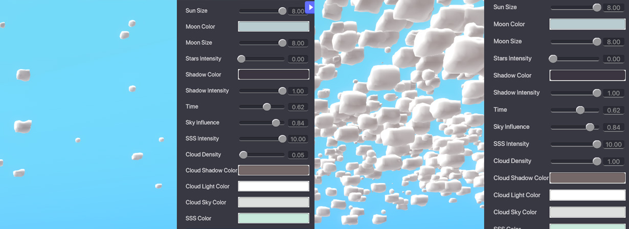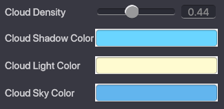 Cloud Density - Determines how many clouds are in the sky. Cloud Shadow/Light/Sky Colour - Determines the colours of the clouds. You can try different settings for different effects.