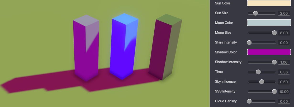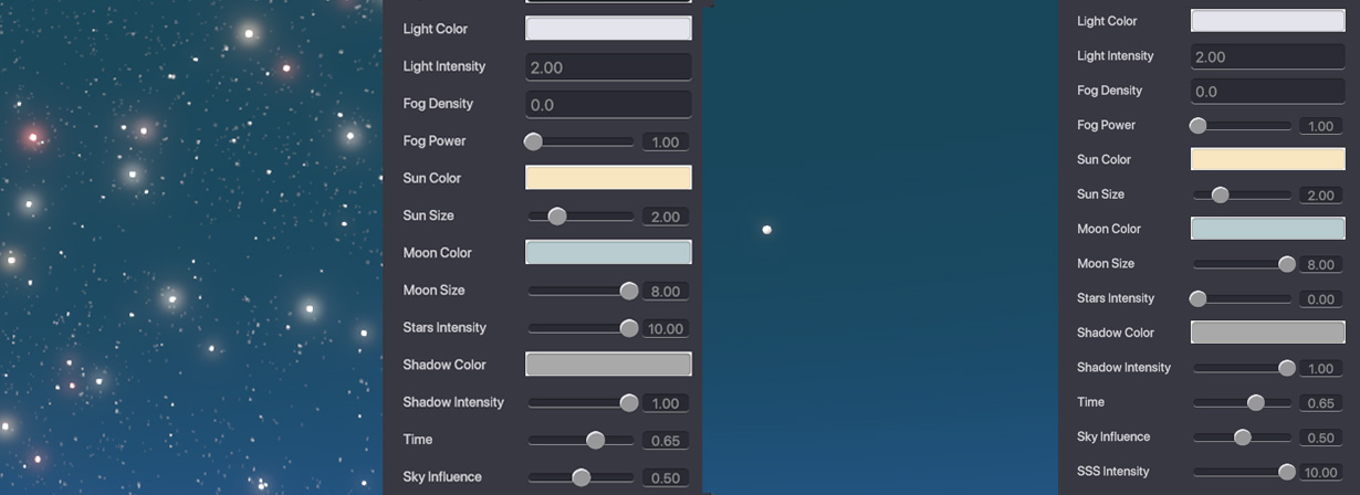 Time - Set the time of the day. Changing this setting will determine whether there will be a moon or a sun in the sky, and also determine the position of them. Value 0.50 is equal to noon. Values 0 and 1 are equal to midnight.