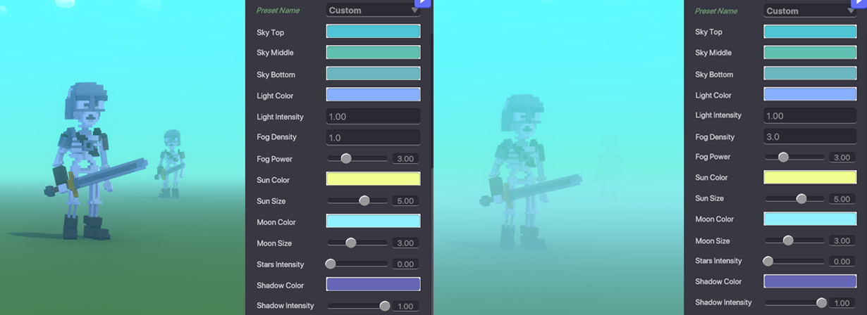 Fog Density - Determines the intensity of fog in the horizon. Fog Power - Determines the strength of the fog in the horizon.