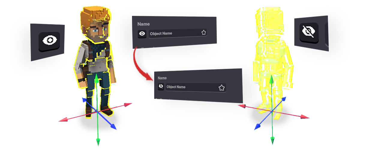 Next to the Name field is an eye icon, which toggles whether an object will be visible or not during play. In Builder Mode, invisible objects are mostly transparent so you can find them.