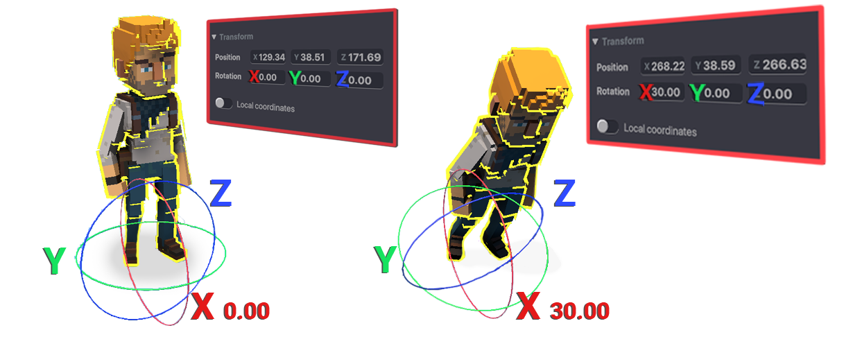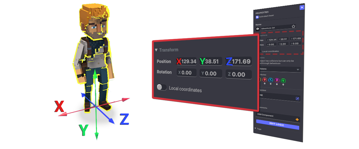 Local Coordinates in the image below show how far our NPC named Jet is offset from where the Pivot Point and front facing direction of his Parent Object, the rabbit, is located.
