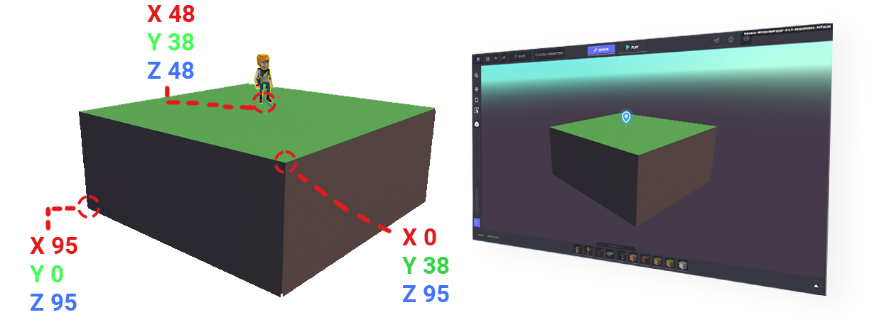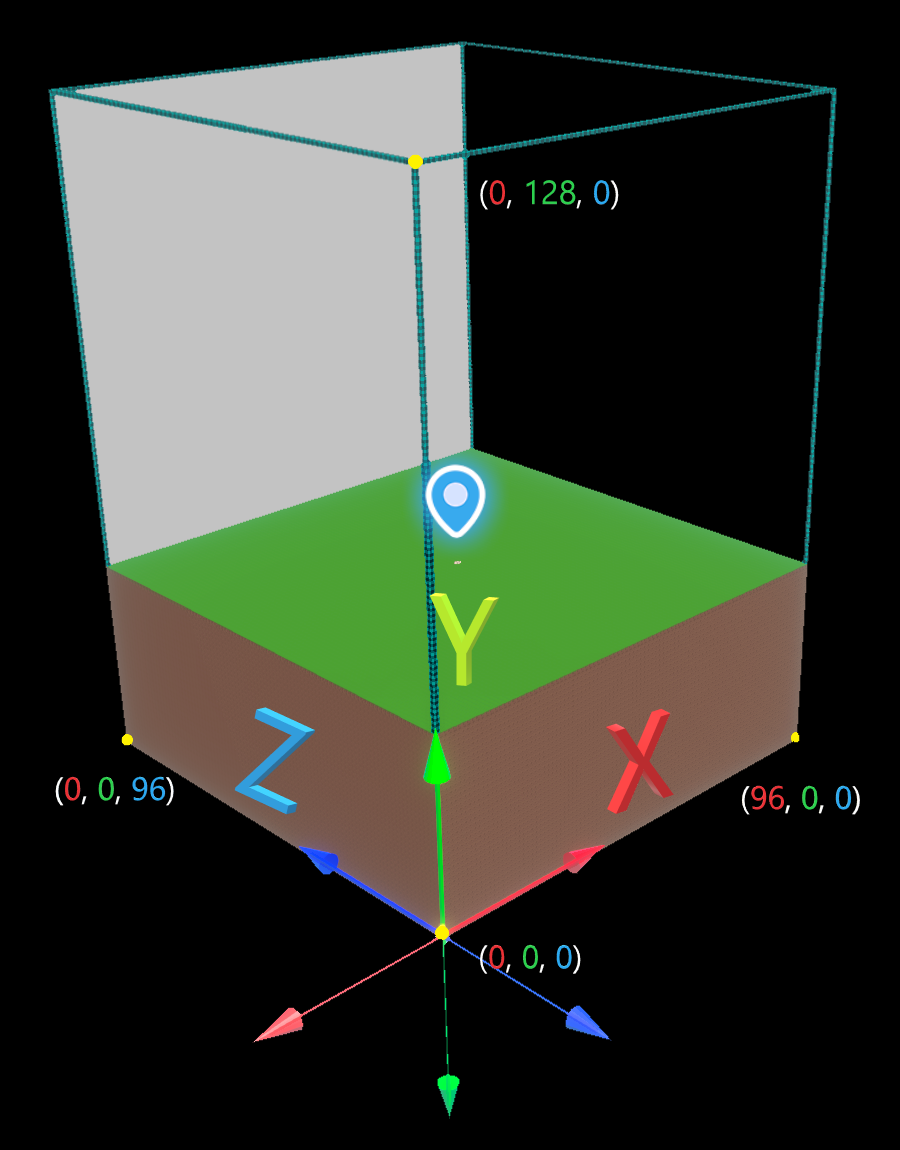The maximum and minimum X, Y, and Z Position coordinates are labeled below. The area colored grey shows the default direction objects will face when placed.