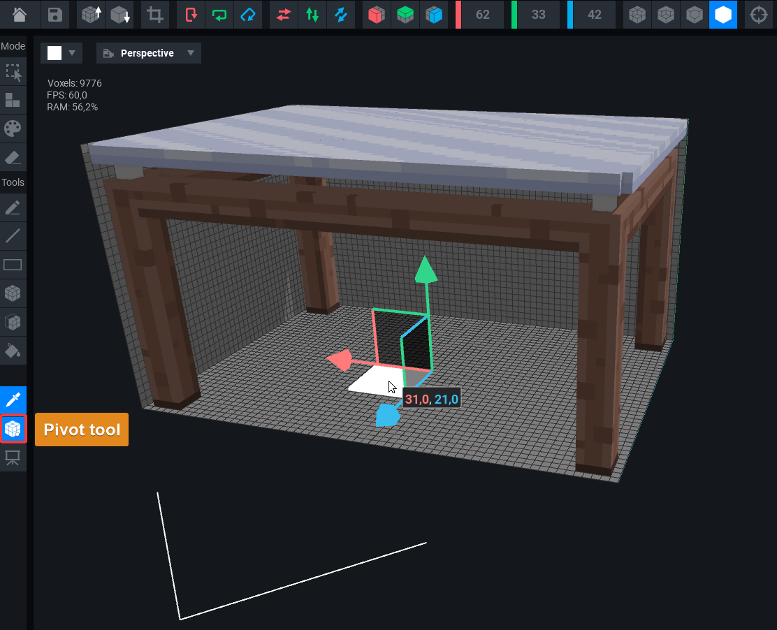 In the VoxEdit image below, the front of an asset is shown by a large white arrow outside of the collision boundary. The Gizmo with red, green, and blue move arrows shows the Pivot Point.