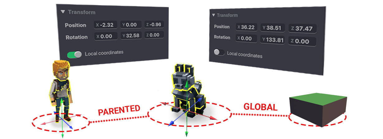 If the Parent Object is moved or rotated, the Child Object follows, and both objects have new Global Coordinates. However, the Child Object's Local Coordinates stay the same since its local relationship to the Parent Object is preserved.