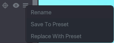 Save the Preset using the Presets button or the ≡ menu in the Hierarchy. A pop-up window will display existing Presets you have made and the option to create a new Preset. Click Create New and give the Preset a name, then click Done.