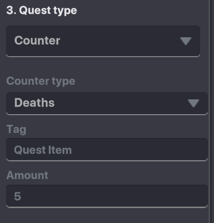 Select Deaths from dropdown, set the tag to count, and set the amount required. Place at least the specified amount of objects in the game world, each with a Health Component and the Tag noted in the Quest applied.