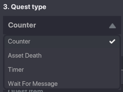 The four types of Quests available are Counter, Asset Death, Timer, and Wait for Message.