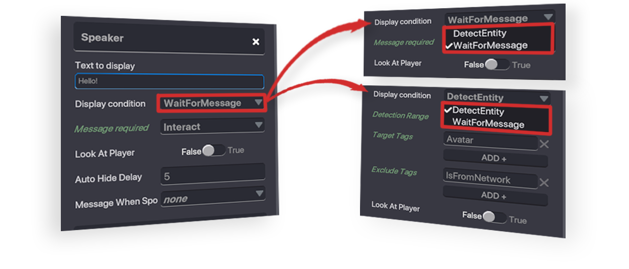 Example: The Speaker Component's Drop Down allows you to choose 'Detect Entity' or 'Wait for Message.' If you choose 'Wait for Message,' a second menu will open and allow you to choose a pre-existing option or create a new one.
