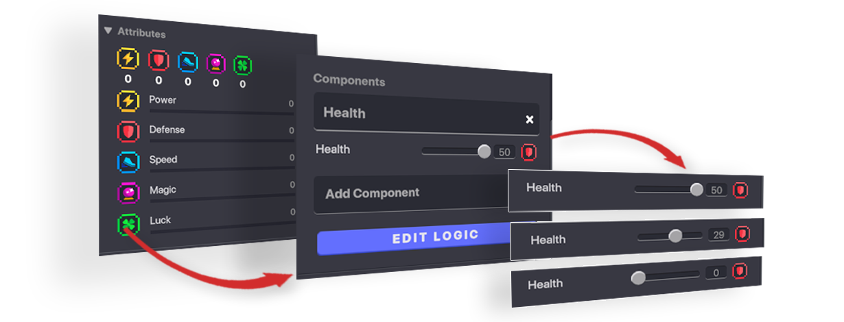 In the Health component, objects with a higher defense Attribute will have a larger range in the health slider.