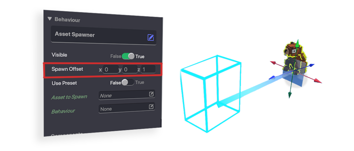 Example: The Asset Spawner Behaviour allows you to offset where an object is spawned in relation to the object with this behaviour, by modifying X, Y, and Z values.