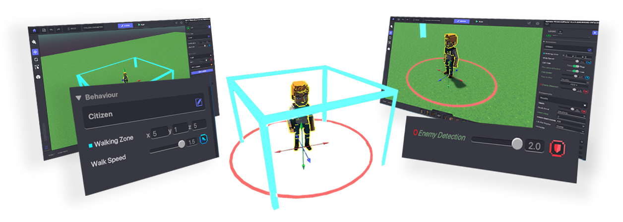 The image below shows how parameters are visualised for Citizen Behaviour. A blue cube represents the Object's Walking Zone and a red circle represents the zone of Enemy Detection.
