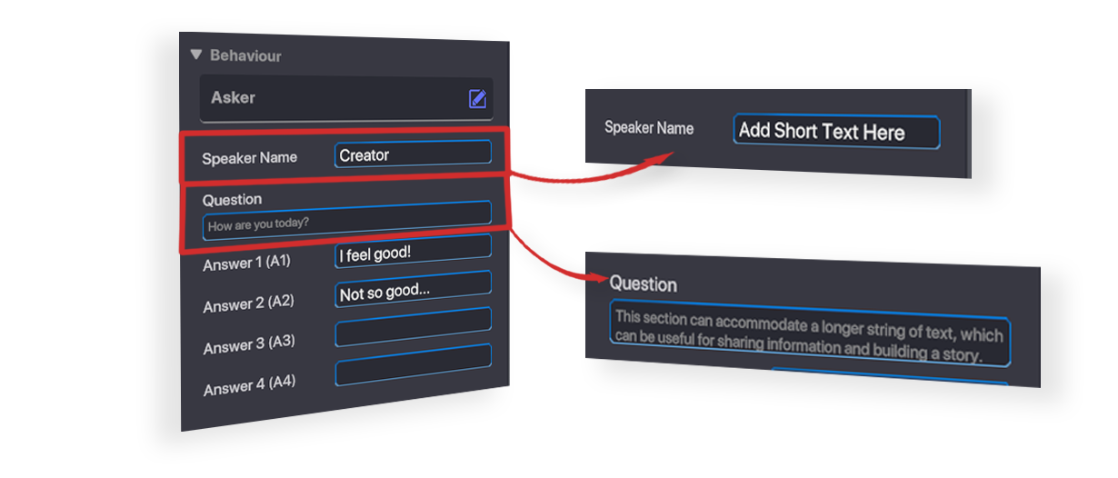 Example: An Asker Behaviour allows for a short text entry for the 'Speaker Name' and a longer text entry for the 'Question.'