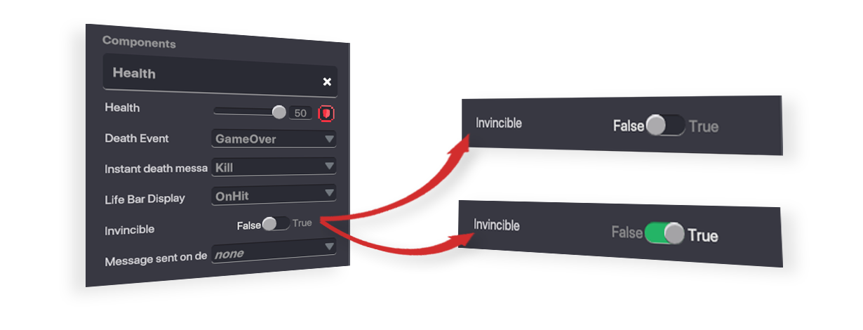 Health component - When Death Event is set to Destroy, the green label Death Delay appears below it for customisation. If Death Event is set to Game Over, Death Delay will not be available.