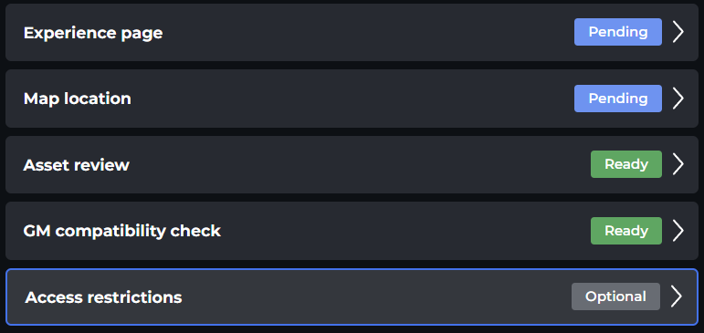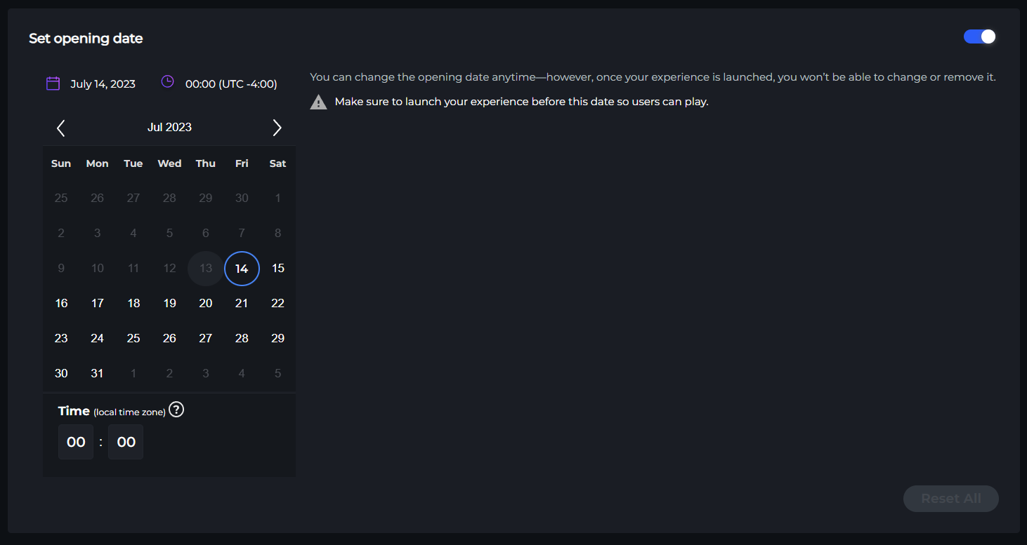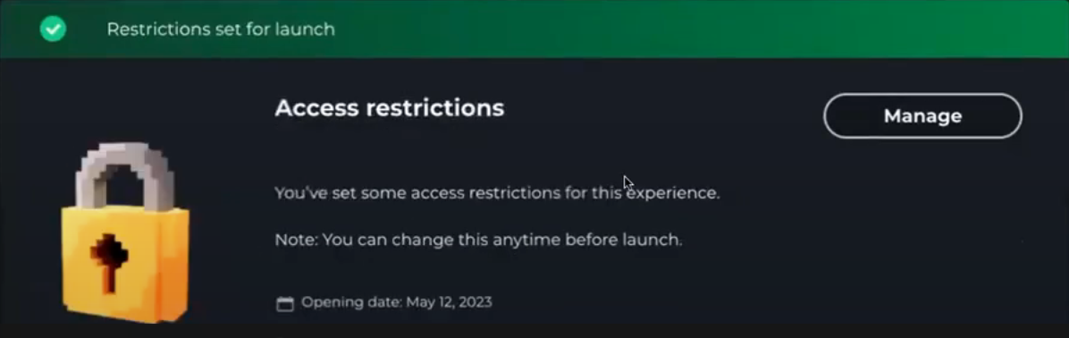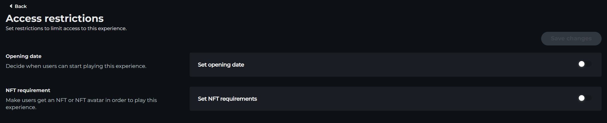 Use the Asset Restrictions tool to set a future launch date and NFT requirements for your Experience.