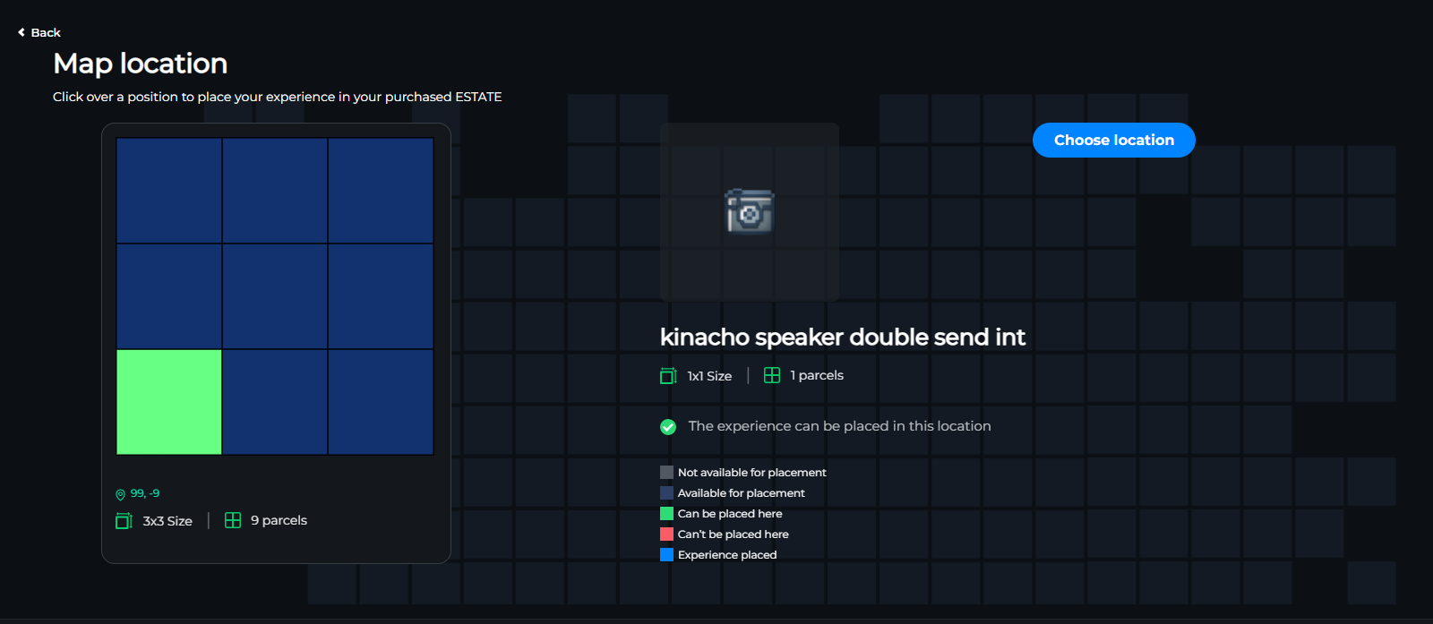 Use the Map Location tool to link your Experiences to virtual LANDs so your descriptive content from your Experience Page can be seen on the metaverse map.