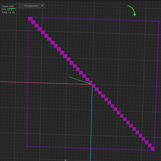 In the example below, the jagged purple model has 240 faces and a collision boundary of 40x40x1, while the smooth green model that is linked to a rotated node in the Animator only has 6 nodes and a collision boundary of 50x1x1.