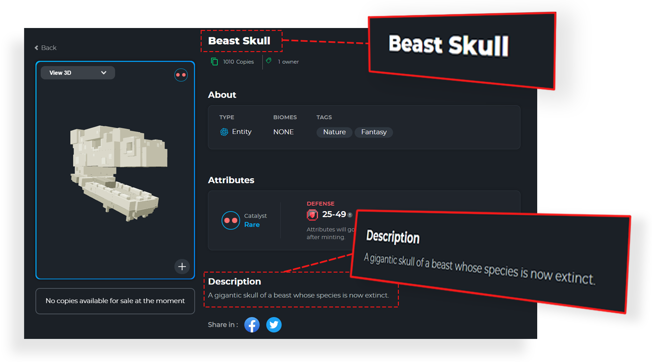Assets can be given a clear description that will appear on The Sandbox Marketplace. Not only will the description serve as a factor in potential buyer purchasing decisions, but it will also help your ASSET be located when it comes to search engine optimisation (SEO).