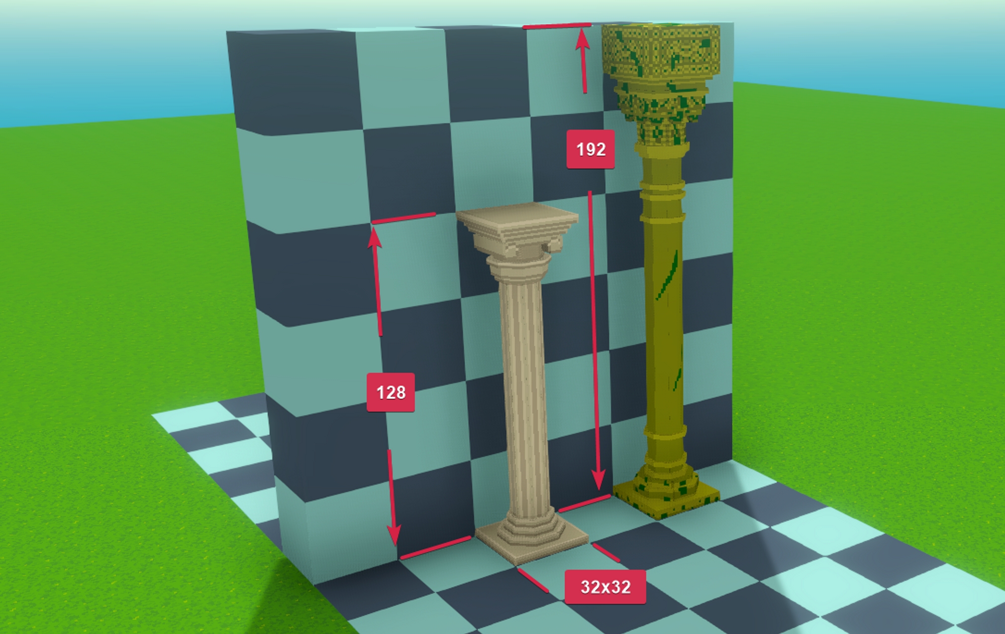 Maximum height: 16 blocks (512 voxels) Minimum height: 12 blocks tall (384 voxels) Base footprint: 8x8 blocks (256 x 256 voxels)