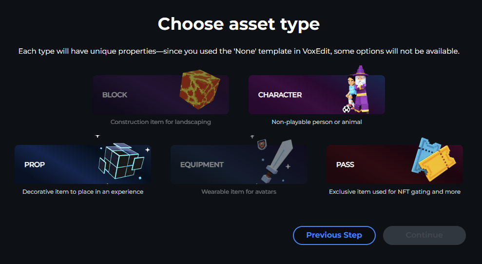 Upload assets from VoxEdit to your Workspace so you can prepare them for the Marketplace or discover them in your Game Maker library to build an Experience.