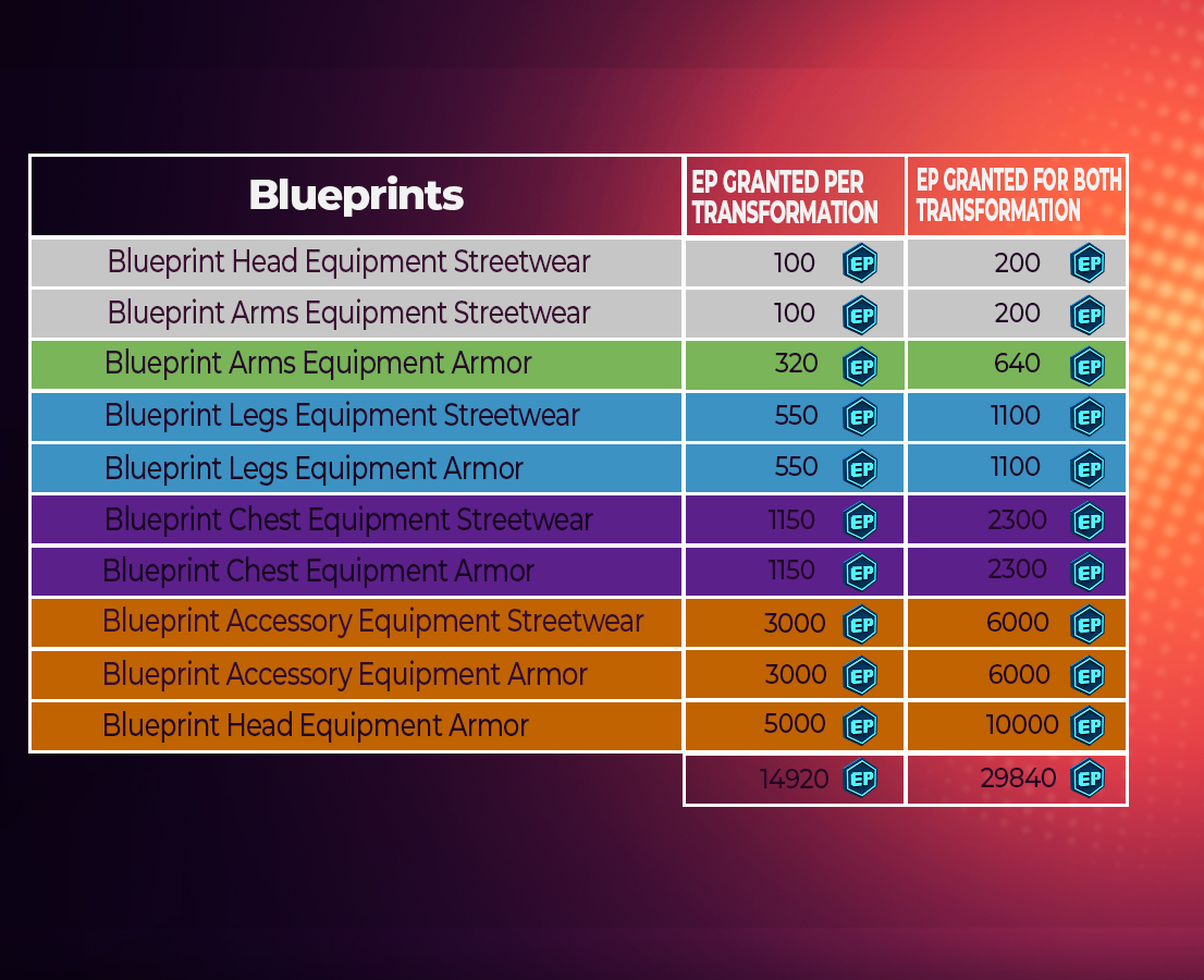 **EP Rewards Based on Blueprints Rarity**