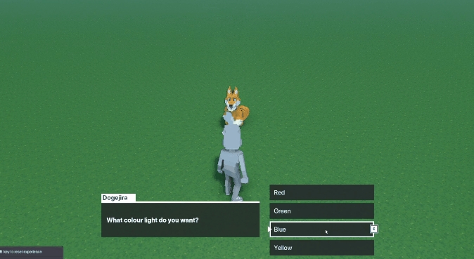 一度やり取りをしたことのあるアバターに対して質問をすることができます。 - 複数の回答がある質問を設定することができます。 - プレイヤーは回答を選択することができます。 - 選択した回答に応じて異なるメッセージを送信してイベントのトリガーとして機能させることも可能です。(例:回答1 を選択するとドアが開いたり、回答2 を選択するとドアが壊れたりと回答によってその後のイベントが変化します)