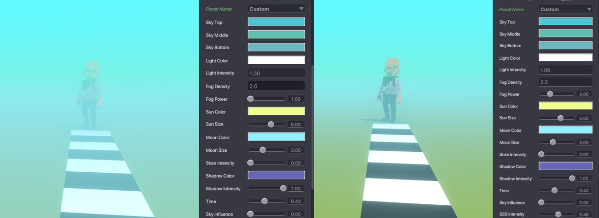 この機能はマルチプレイヤーのビヘイビアとして新たに追加された機能です。体験のムードやテーマに合わせて雰囲気を変えることができ、さらに光の色、太陽と月の位置、雲の密度、星の明るさなどを設定することができるオプション機能もついています。