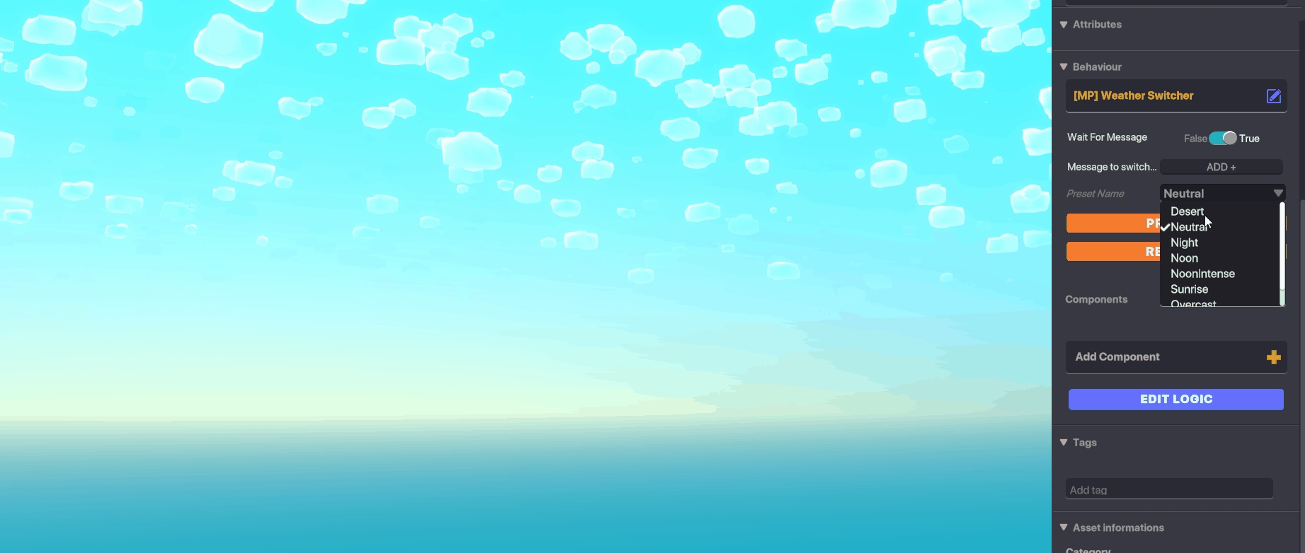 Weather Switcher のビヘイビアはデフォルト設定のPreset(プリセット)として開き、Desert(砂漠)、Neutral(ニュートラル)、Night(夜)、Noon(昼)、Sunrise(日の出)、Overcast(曇り) からテーマを選んで変更することができます。