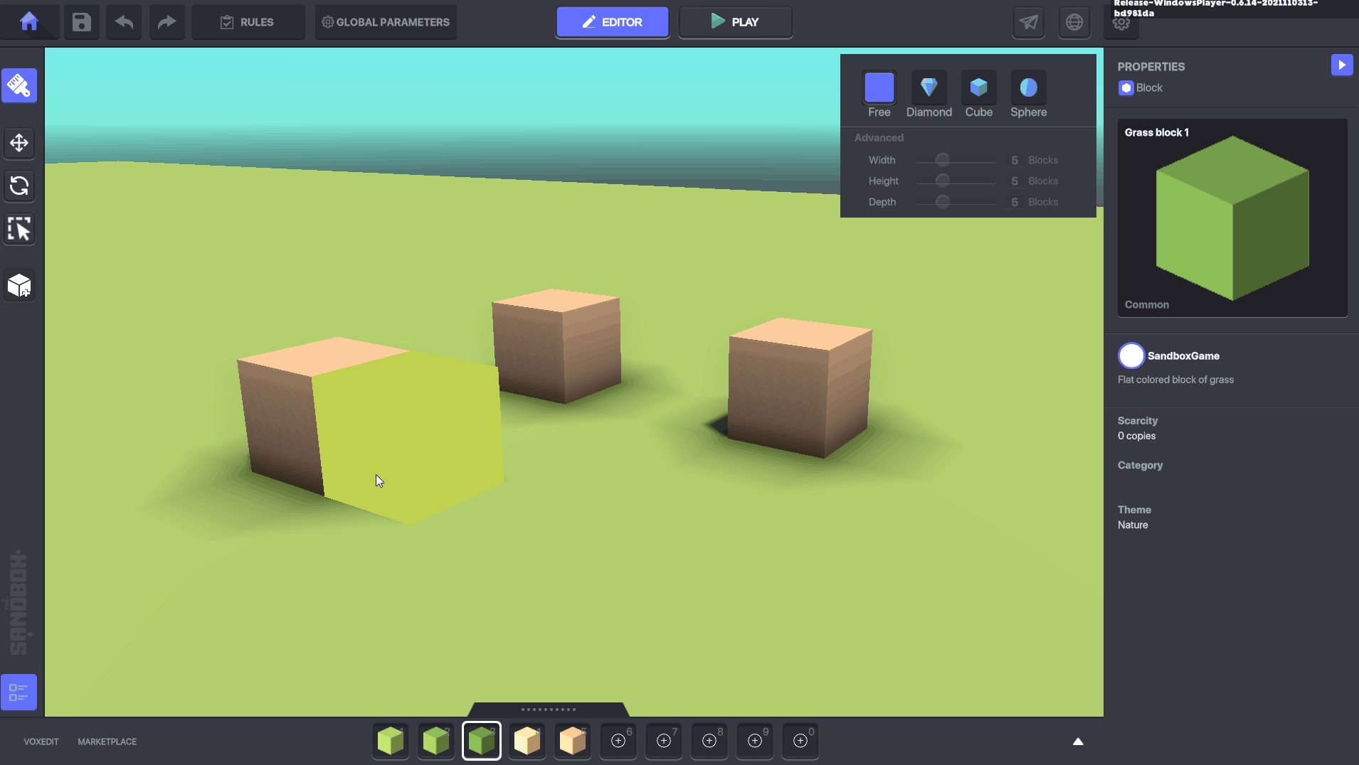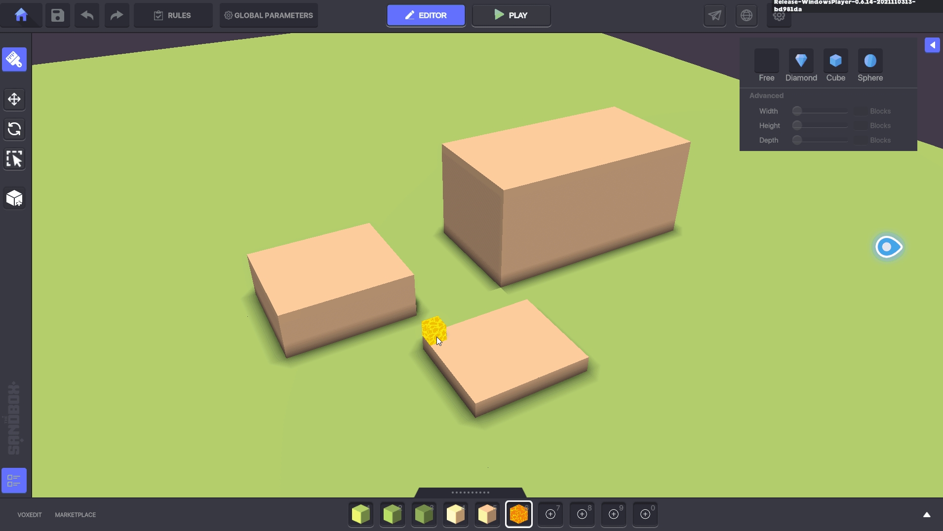 ブラシのデフォルト設定はFree Mode(フリーモード)になっていて、選択したブロック を一つずつ配置することができます。