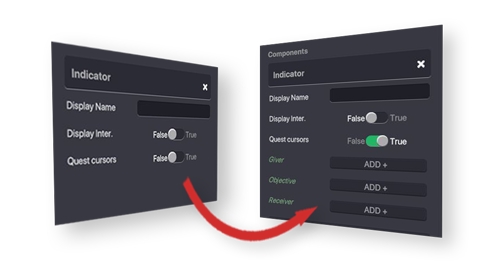 この場合、Indicator のコンポーネントを選択すると、Quest Cursors(クエストカーソル)の設定にFalse と True が表示されます。