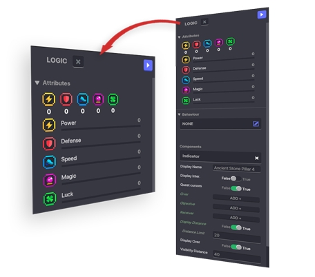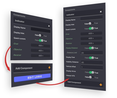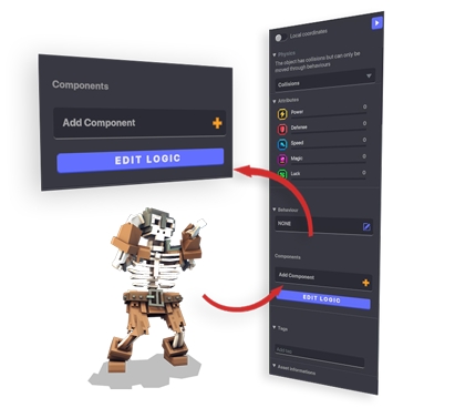 Add Component の下にある青いEdit Logic のボタンをクリックすると作業中のオブジェクト に紐づけられたコンポーネントとビヘイビアの値やトグルなどが表示されます。