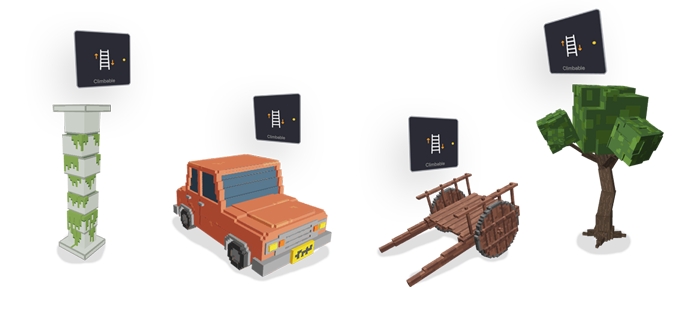 使い方によってはClimbable のコンポーネントが適していないものもありますが、柱、ツル、岩、銅像、木、電柱、車など自分の作りたい世界に合わせて、様々なオブジェクトにこの機能を使うことができます。