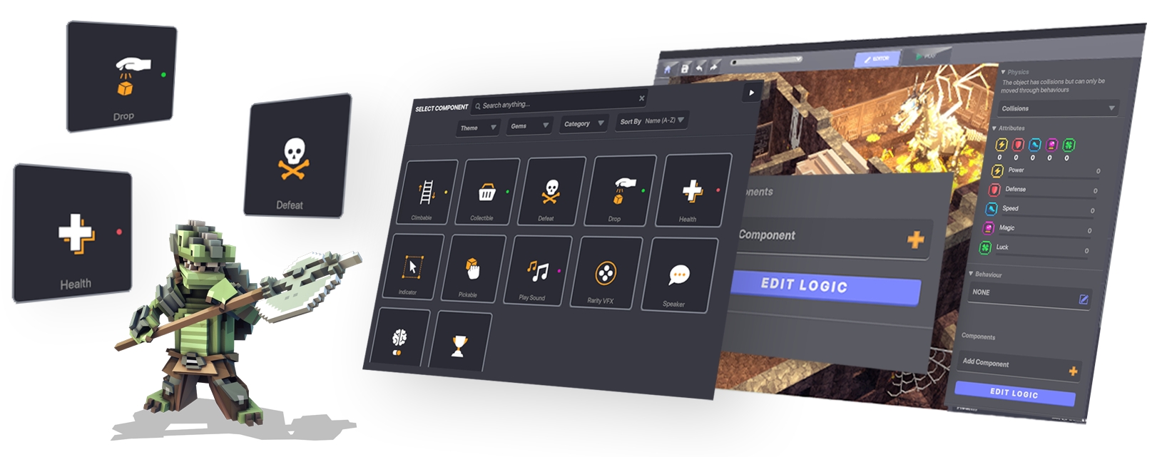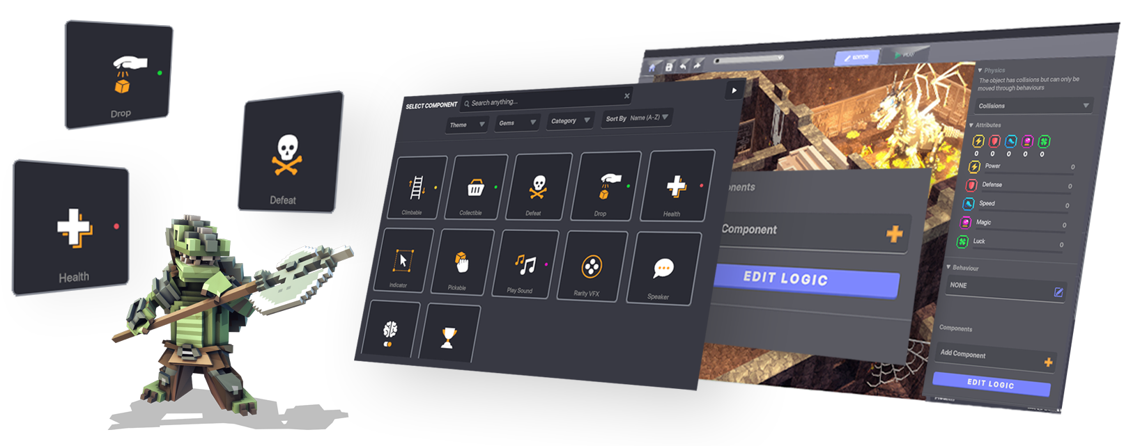 例えばHealth のコンポーネントにあるInvincibility(無敵) のトグルでダメージを受けないオブジェクトをクリックするだけで作ることが可能になります。🛡️ またオブジェクトを倒したらトレジャーを落とすという設定も作ることが可能です。