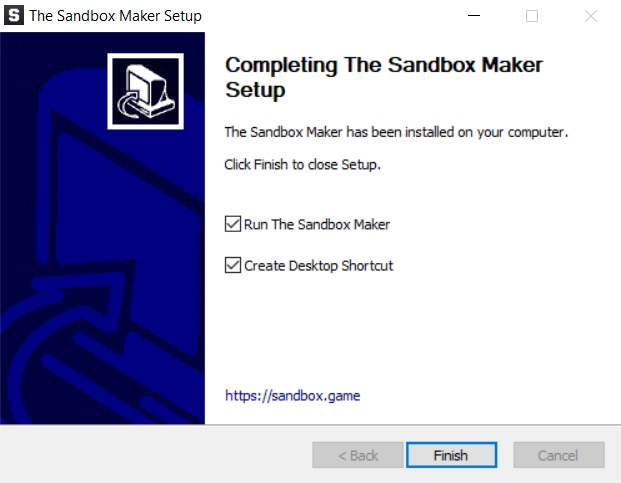 Run The Sandbox Maker(The Sandbox Maker を実行する)とCreate Desktop Shortcut(デスクトップにショートカットを作成)にチェックを入れます。(オプションのため必要なければスキップしてください。)