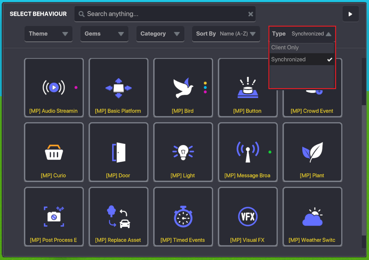 ビヘイビアとコンポーネントのSynchronized を選択するにはポップアップ画面右上にType(タイプ)と書かれたドロップダウンより切り替えを行ってください。Synchronized を選択すると画面が更新され、黄色の文字でアイテムの名前の前に [MP] と表記されている選択肢が表示されます。