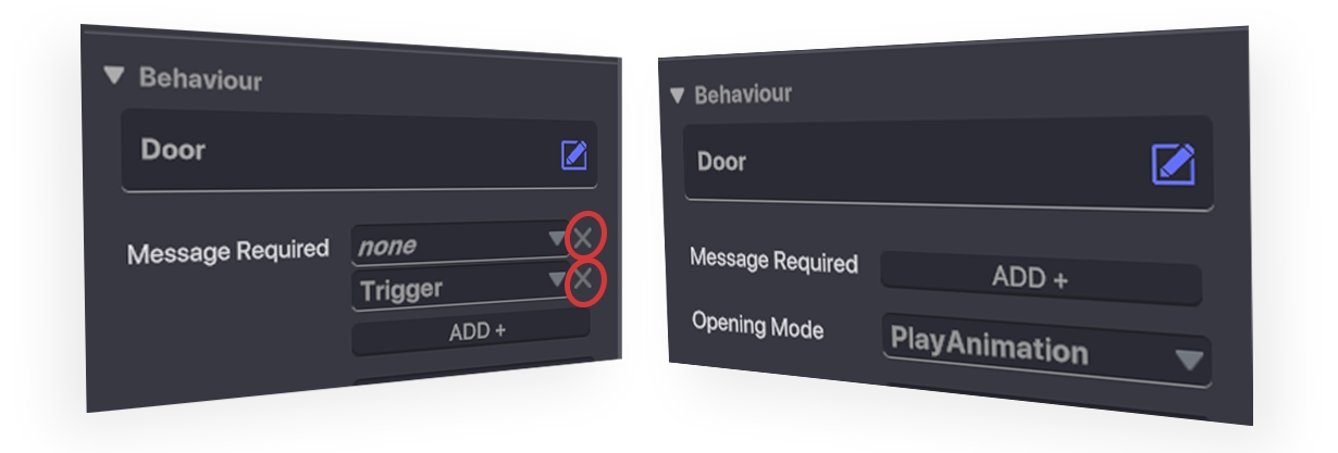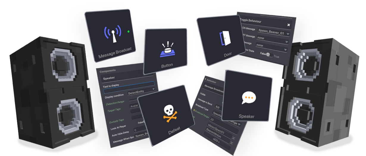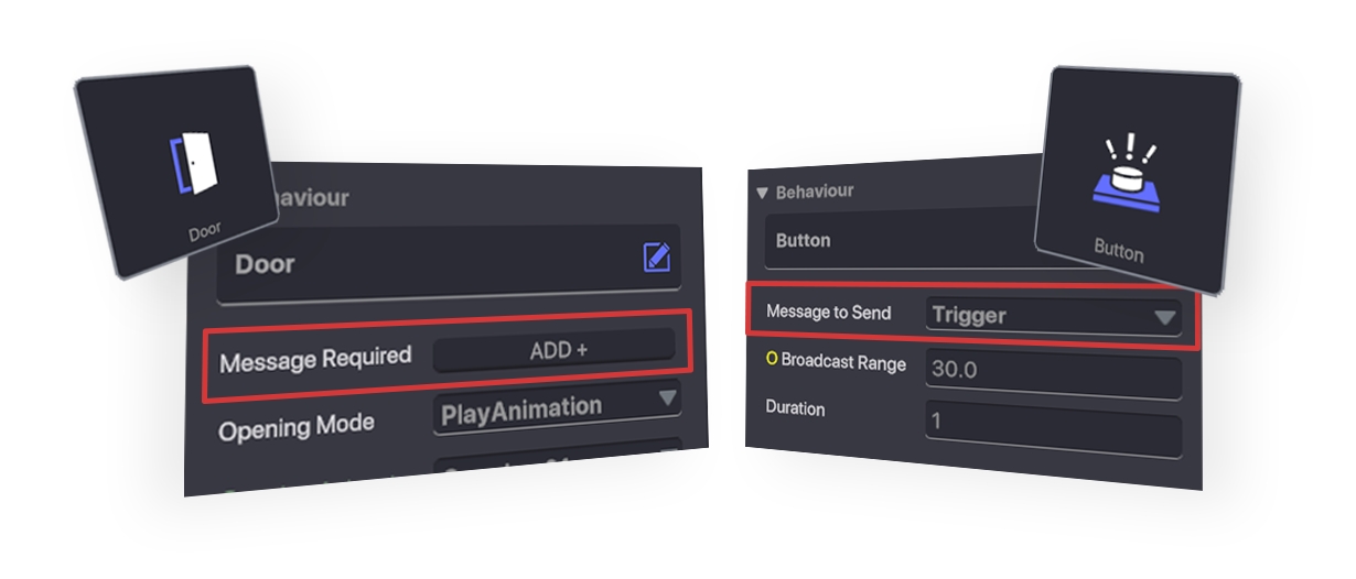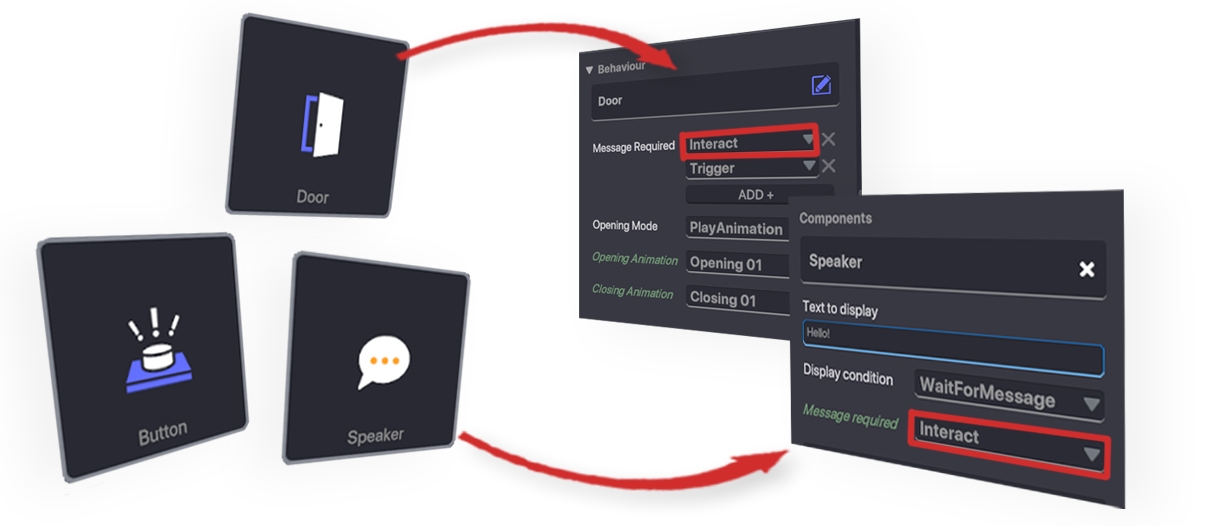 Button のビヘイビア 、Door のビヘイビア、Speaker のコンポーネントではInteract のメッセージを聞くようにMessage Required のパラメーターのプリセットに設定されています。